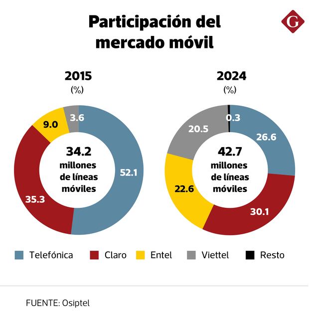 No es un secreto que en la última década Telefónica (que opera la marca Movistar) ha perdido terreno en el mercado. El último domingo pasó oficialmente a manos del fondo Integra Tec, vinculada al grupo argentino Integra Capital. Según datos del Organismo Supervisor de Inversión Privada en Telecomunicaciones (Osiptel), su participación en el segmento móvil cayó abruptamente de 52.1% en 2015 a 26.6% en 2024. De haber sido líder absoluto, hoy Telefónica apenas controla poco más de una cuarta parte del mercado, por debajo de América Móvil (Claro). Con nuevo dueño, la gran incógnita es: ¿se puede detener la caída de Telefónica?
