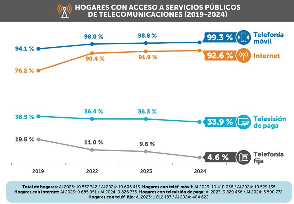 Erestel también señala que el 99.5% de los hogares accede a al menos un servicio de telecomunicaciones, con la telefonía móvil a la cabeza (99.3%), seguida por el internet (92.6%). Por el contrario, servicios como la televisión por cable (33.9%) y la telefonía fija (4.6 %) continúan en retroceso.