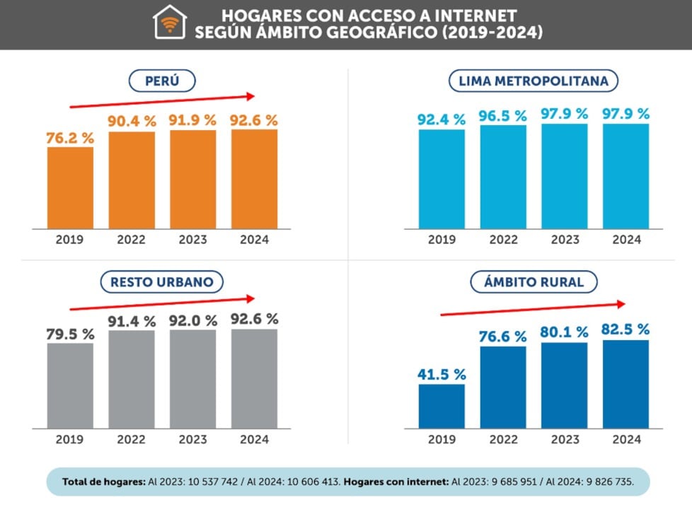 El acceso a internet en el país mantiene su ritmo ascendente. Al cierre de 2024, el 92.6 % de los hogares peruanos contaba con conexión a internet fijo o móvil, según la Encuesta Residencial de Servicios de Telecomunicaciones (Erestel), elaborada por Osiptel. En términos absolutos, más de 9.8 millones de hogares estaban conectados.