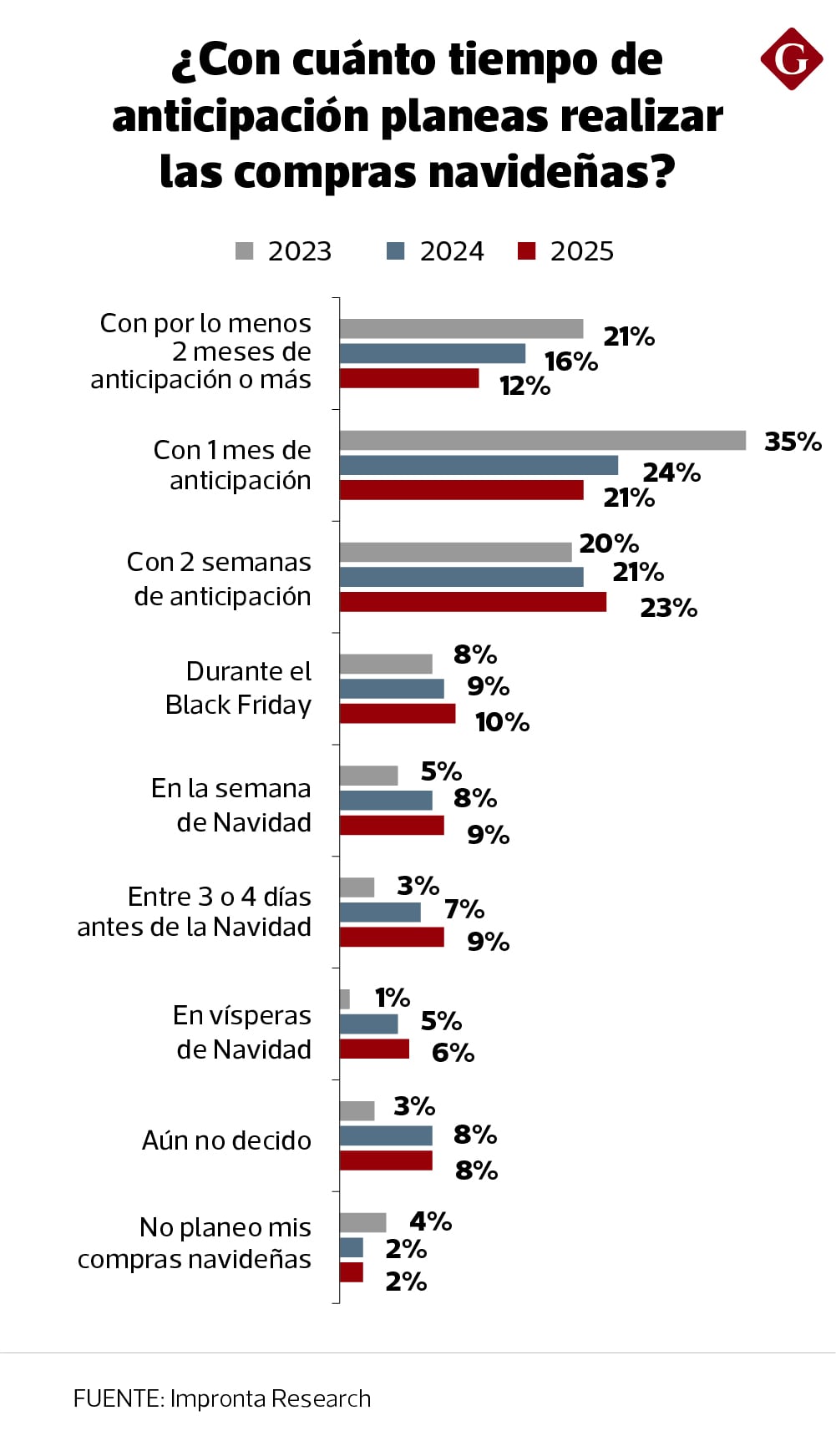 En esa línea, dentro de los que indicaron que realizarían compras en esta fecha, un 66% ya concretó sus adquisiciones de Navidad, siendo que las transacciones físicas u online iniciaron, por lo menos, desde fines de octubre y se extendieron hasta la última semana de noviembre, en el marco del Black Friday. A diferencia, un 24% ha optado por realizar dichas compras en la semana previa o a vísperas de Navidad; en tanto, un 10% aún no decide o no tiene costumbre de planear compras navideñas.