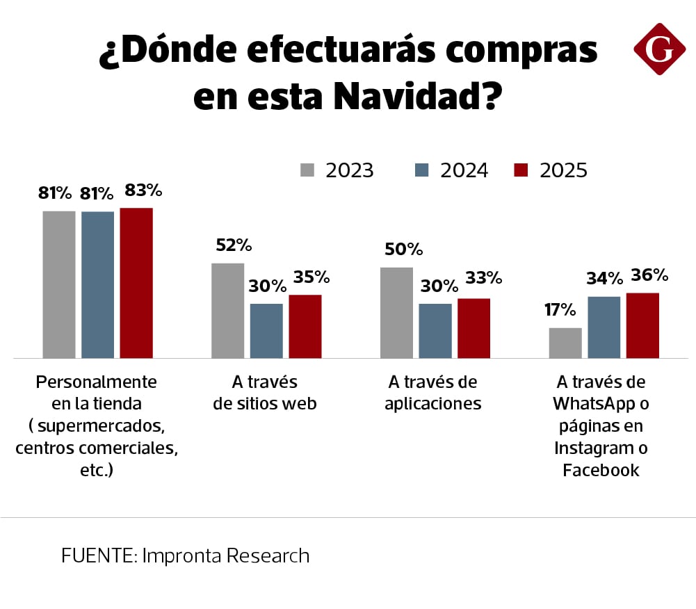 En torno a los lugares de compra, la adquisición en tiendas (supermercados, centros comerciales, entre otros) lidera las preferencias, con un 83%; seguido de sitios webs (35%), aplicaciones delivery (33%); además, de Whatsapp, Instagram o Facebook (36%). “Hay una fuerte convivencia de canales durante las compras en la campaña navideña, las aplicaciones de delivery se convierten en una alternativa de compra; mientras las redes sociales van ganando espacio en el mix de canales”, destacó.