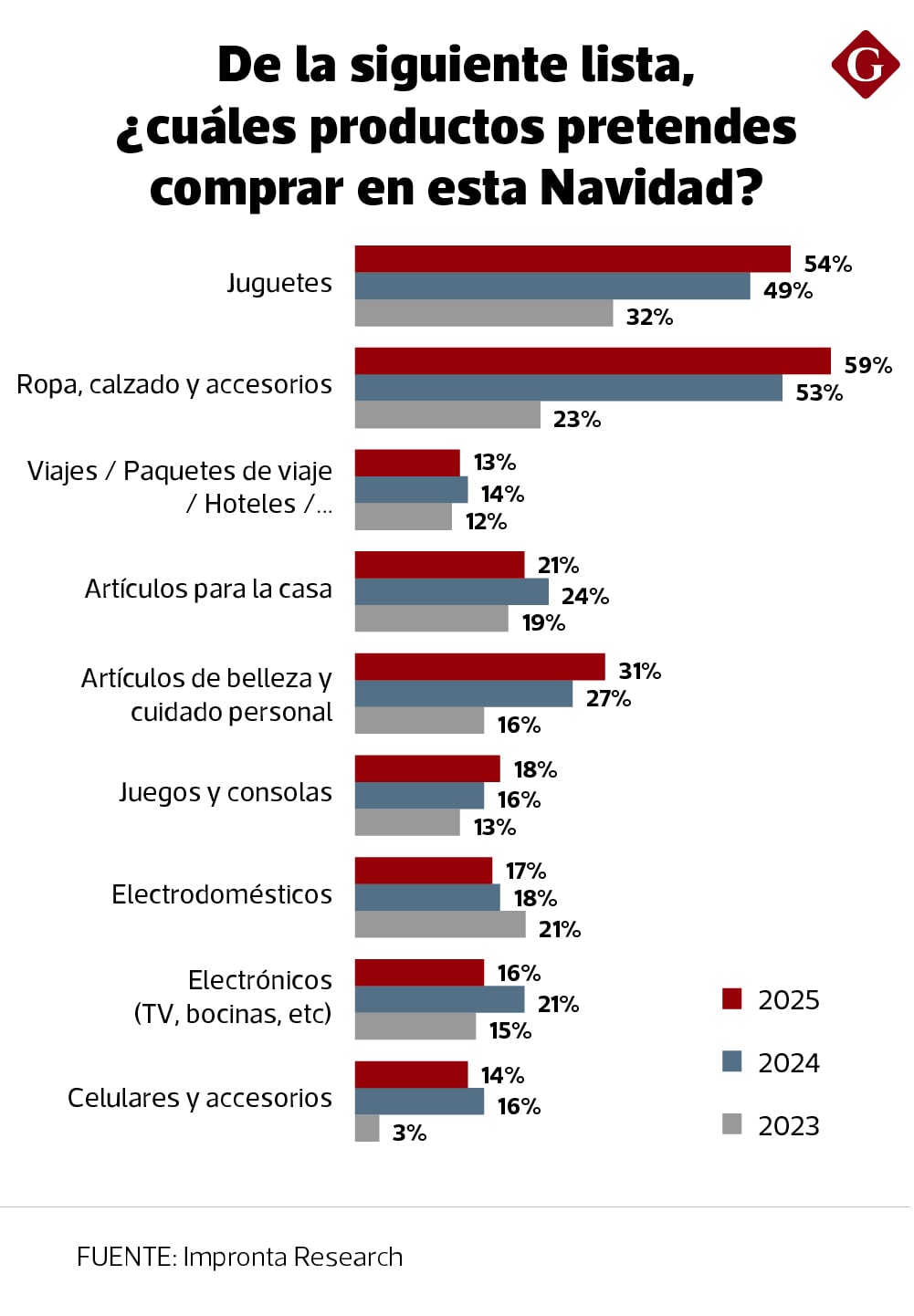 Los productos que se encuentran dentro de las prioridades de los compradores; principalmente, son juguetes, ropa, calzado y accesorios. En la lista continúan paquetes de viajes y hoteles; artículos para la casa; elementos de belleza y cuidado personal; juegos y consolas, electrodomésticos, entre otros.