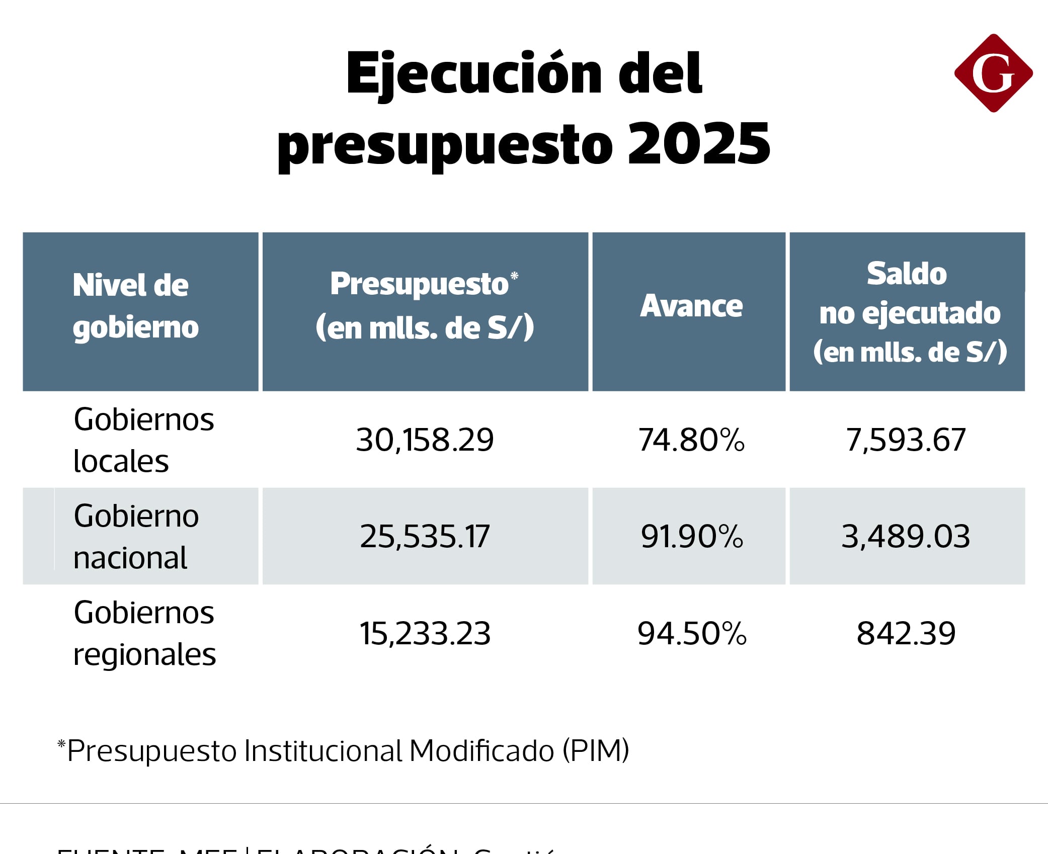 Los que mostraron el desempeño más bajo fueron los gobiernos locales (municipios), al registrar solo un avance de 74.8% y dejando un presupuesto de S/ 9,537.16 millones.