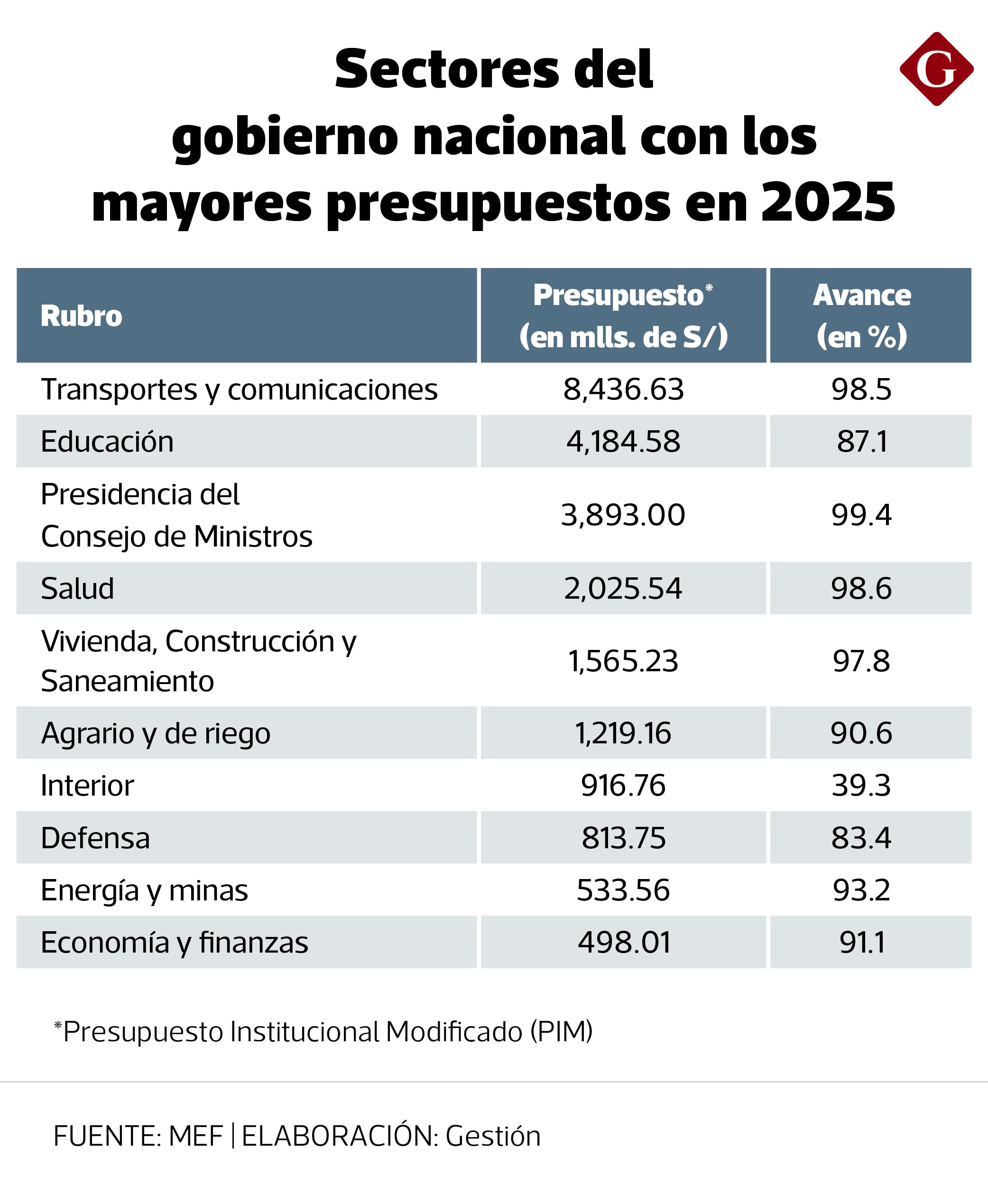 Si se desagrega el Gobierno nacional por sectores, son seis aquellos que recibieron en el 2025 más de S/ 1,000 millones para sus proyectos: Transportes y Comunicaciones; Educación; Presidencia del Consejo de Ministros; Salud; Vivienda, Construcción y Saneamiento; y Agrario y de Riego.