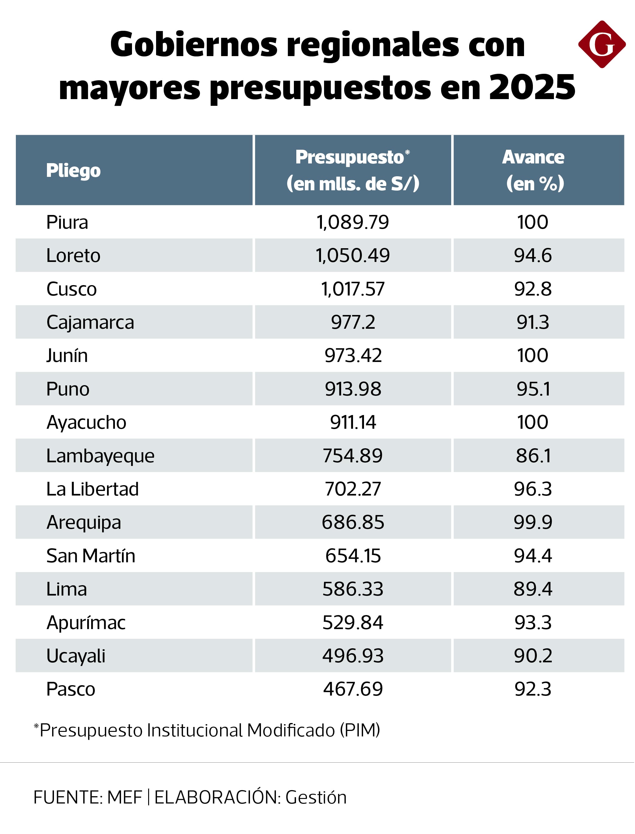 Otros gobiernos que lograron la ejecución de su presupuesto total fueron: Junín (S/ 973 millones) y Ayacucho (S/ 911 millones).