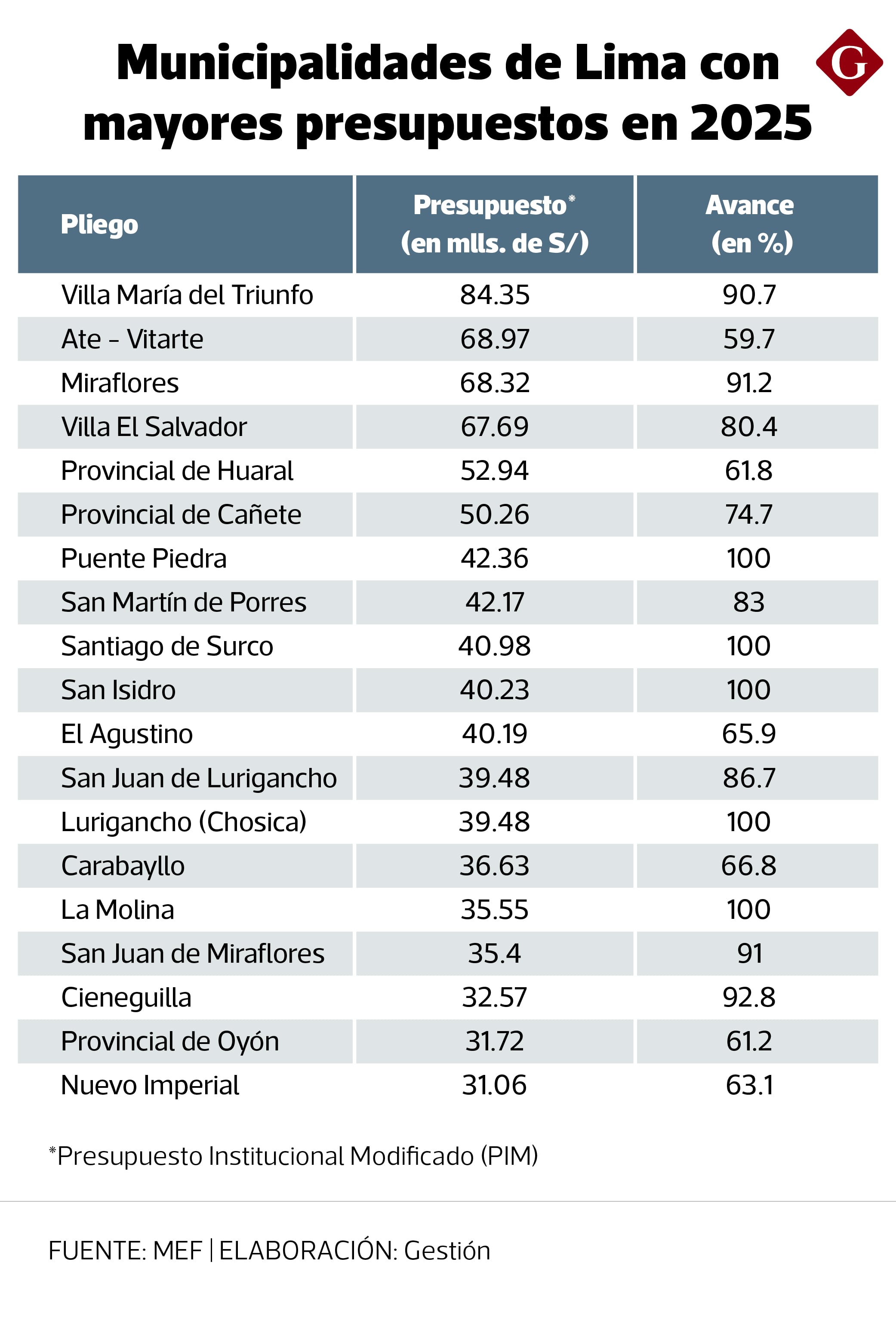 En el caso de Lima, se registró que nueve municipalidades lograron gastar el total de su presupuesto para el desarrollo de obras públicas, abarcando entre los S/ 6.11 millones y los S/ 42.36 millones. Aquí aparecen Santiago de Surco, San Isidro, Puente Piedra, Magdalena del Mar, Lurigancho (Chosica), La Molina, Breña, San Luis y Jesus María.