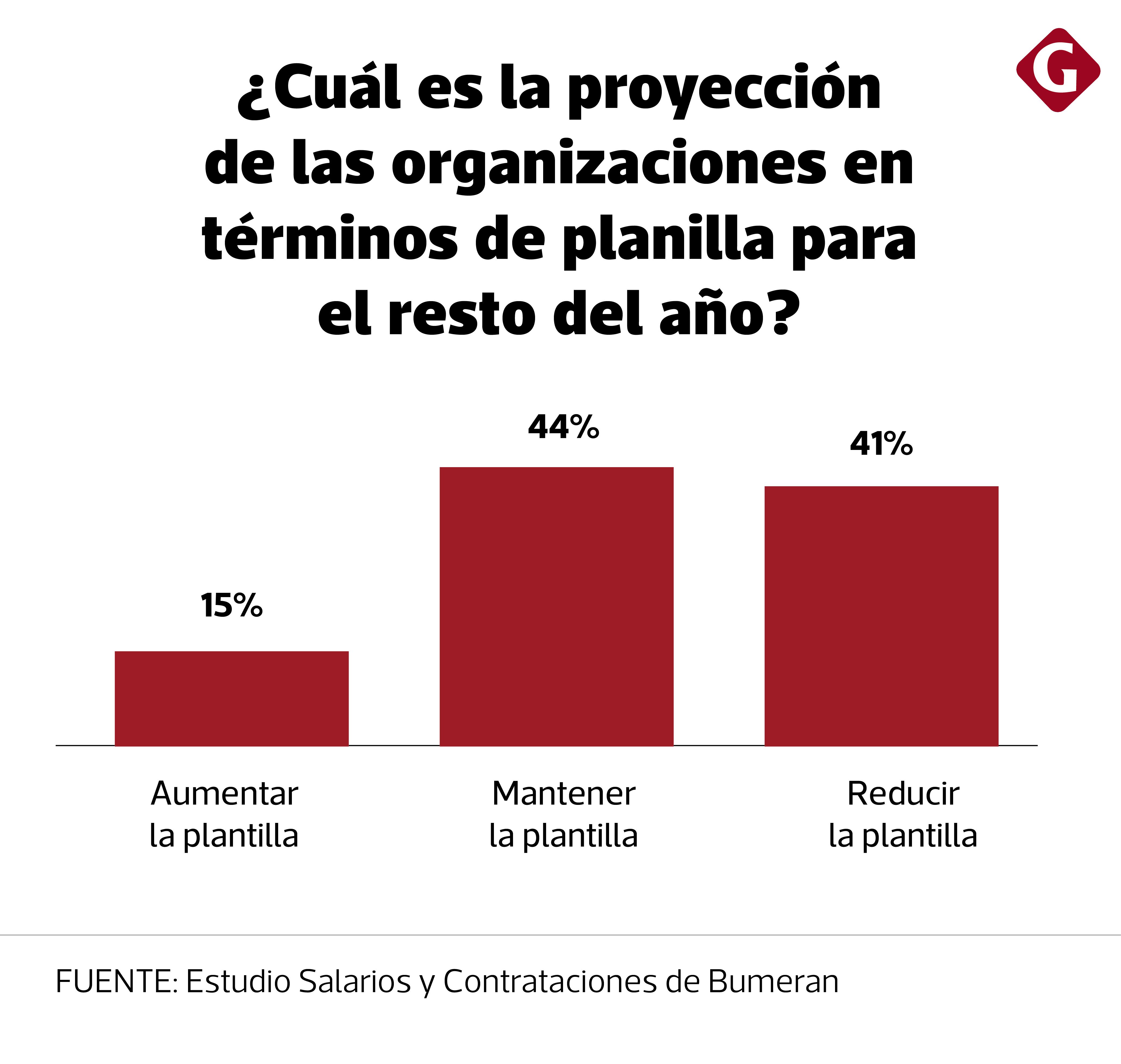 Estas estimaciones también se ven reflejadas en el último estudio Salarios y Contrataciones de Bumeran. Para el segundo semestre, un 44% anticipa mantener su planilla sin cambios, mientras que el 15% restante planifica aumentarla.